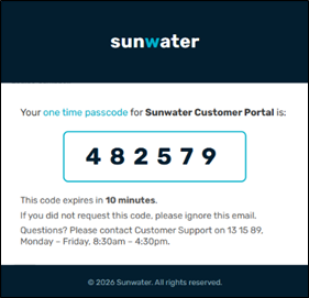 You will receive an email with your OTP from customersupport@sunwater.com.au. It will look like this: