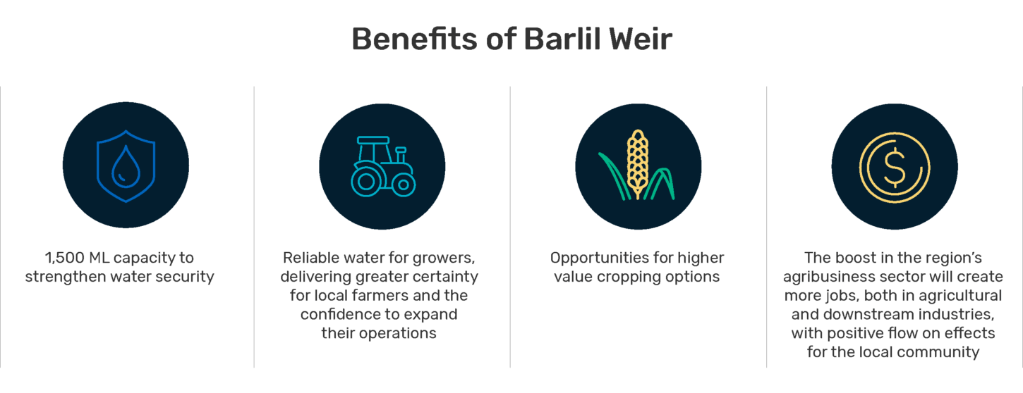 Once complete, Barlil Weir would increase the reliability of existing water allocations to provide opportunities higher value cropping options or expansion of agriculture in the area.